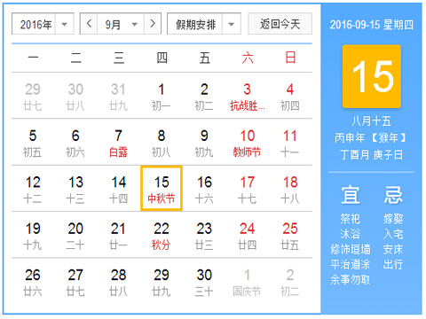 2016年9月15日(星期四,农历中秋当日)为国家法定节假日;