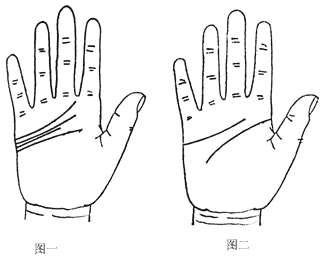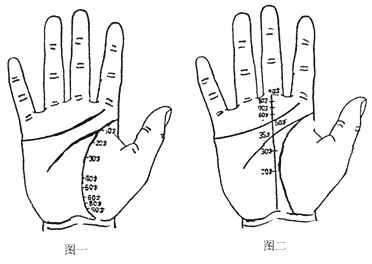 2、命运线与年龄:跟生命线恰相反,由手腕算起到中指指根为止。(图二)