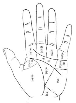 看掌纹时,手掌的部位十分重要,所谓手掌的部位,在手相术称为丘,丘就是手心上每个鼓起厚厚的部位,它具有各线纹一样各种不同的名称及意义,评论丘必须整体平均衡量高低厚薄。同时出现于手掌上的大小无数的线纹,都由一个丘走到另一丘,能记清楚丘的意义,在看手纹时十分有用。