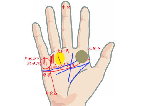 太阳丘在无名指的根部,代表着财富,如果手掌中太阳丘隆起,说明此人很具有赚钱的才能,工作中奖金多,财运上易有意外发财的机会,并且能存的住的钱,一定不为钱财而累,男的财运好,女的则容易嫁有钱老公,属于大富大贵的手相之一。