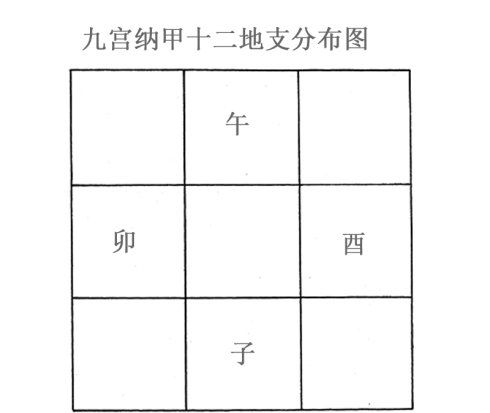 十二个地支代表十二个生肖,古人用十二种动物来代表这十二个属性,我们可以通过很直观的动物属性来辨别不同生肖的人士的基本特征。在十二个地支中,有四个地支是很特殊的,我们用九宫纳甲的原始图来看这四个地支所在的位置(如图):